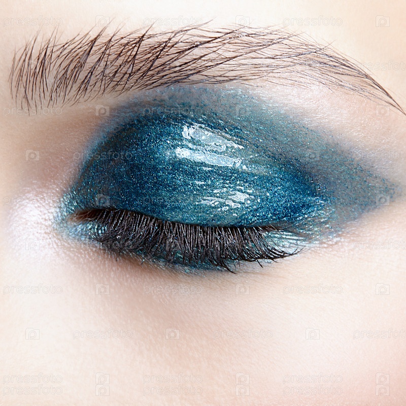Крупный план макросъемки закрытого человеческого женского глаза. Девушка с идеальной кожей и сине-зелеными тенями
