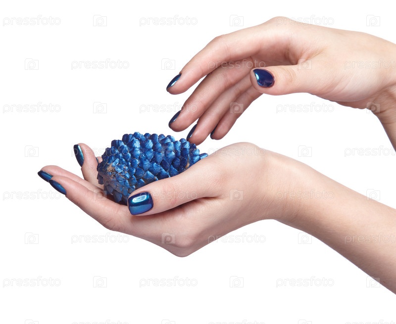 Женские руки с синей рождественской еловой шишкой и блестящим маникюром ногтей изолированы на белом