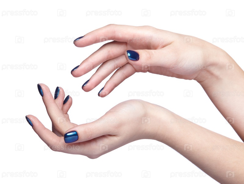 Женские руки с синим и блестящим маникюром ногтей, изолированные на белом фоне