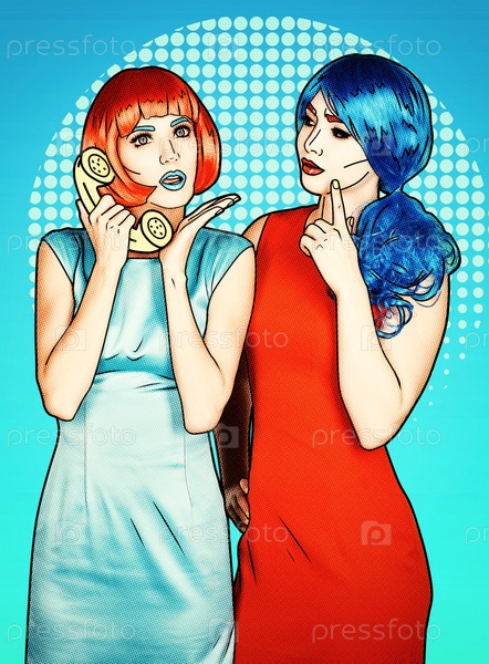 Портрет молодых женщин в стиле комического поп-арта. Женщины в красных и синих париках звонят по телефону