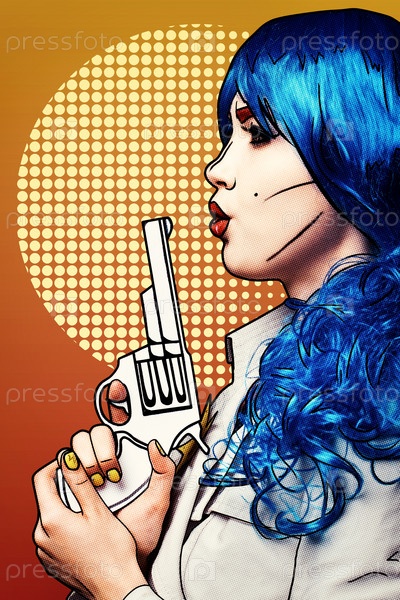 Портрет молодой женщины в стиле комического поп-арта. Женщина с пистолетом в руке