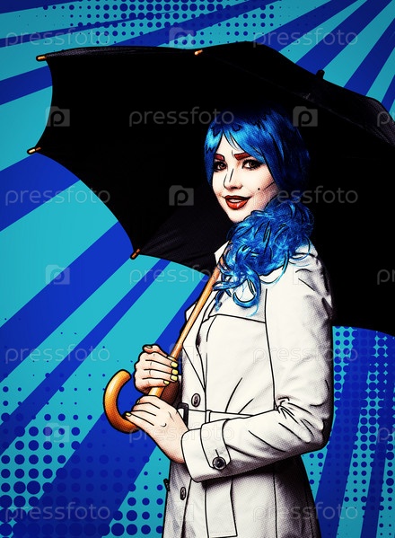 Портрет молодой женщины в стиле комического поп-арта. Женщина с зонтиком на синем мультяшном фоне