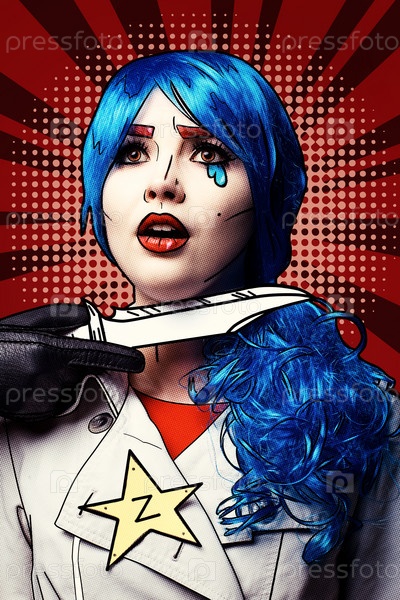 Женщина с ножом возле горла. Портрет молодой женщины в стиле комического поп-арта