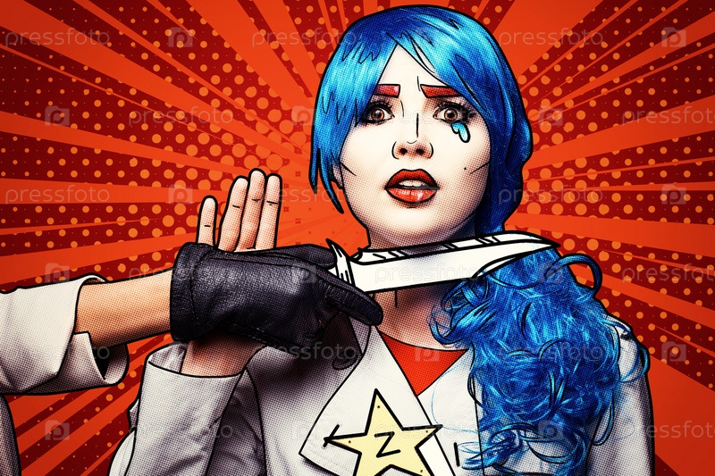 Женщина с ножом возле горла. Портрет молодой женщины в стиле комического поп-арта