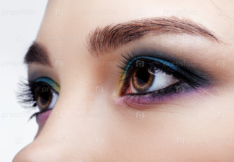 Крупный план макросъемки человеческого женского глаза. Девушка с идеальной кожей и сиренево-голубо-желтыми тенями для глаз
