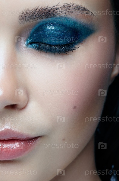 Крупным планом макро портрет женского лица с закрытыми глазами. Половина лица женщины с вечерним макияжем