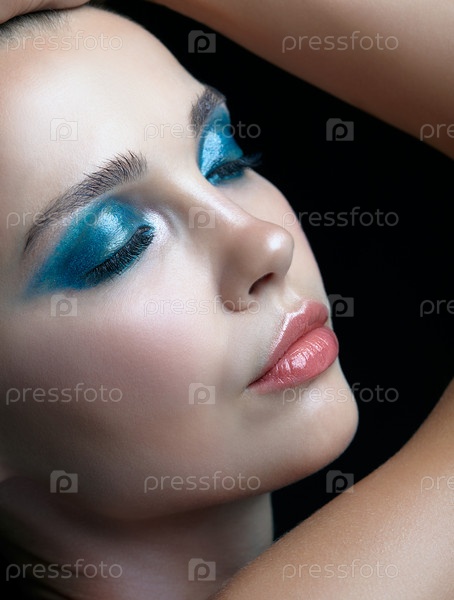 Молодая женщина с идеальной кожей и сине-зелеными дымчатыми тенями для глаз