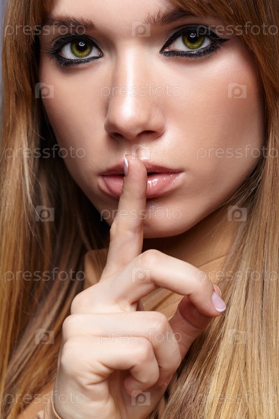 Портрет блондинки с пальцем на губах. Женщина с зелеными глазами и длинными волосами. Девушка в бежевом платье на сером фоне