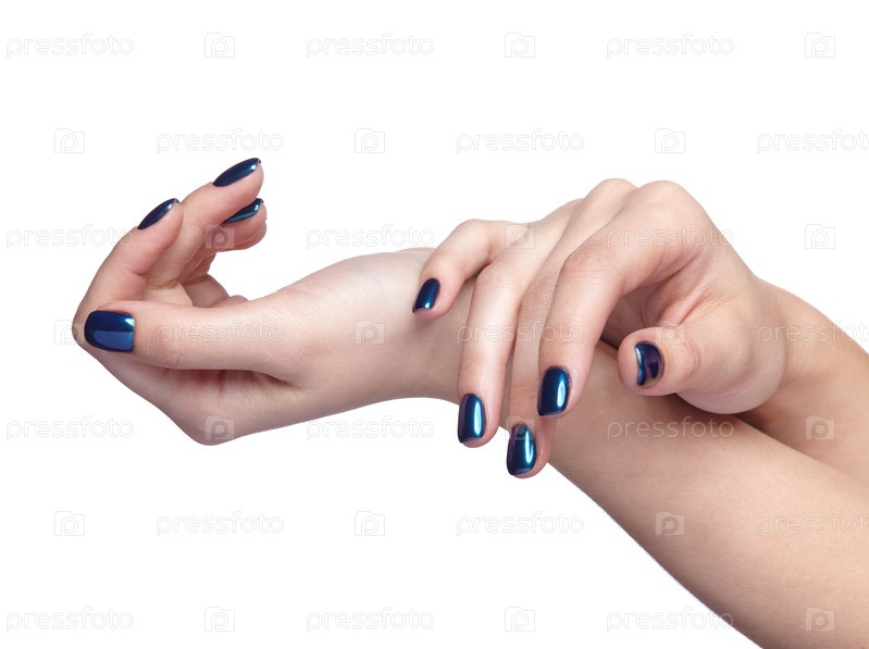 Женские руки с синим и блестящим маникюром ногтей, изолированные на белом фоне