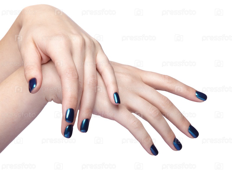 Женские руки с синим и блестящим маникюром ногтей, изолированные на белом фоне