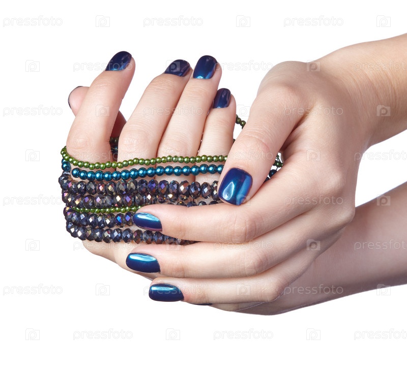 Женские руки с бижутерными бусинами и блестящим маникюром ногтей изолированы на белом