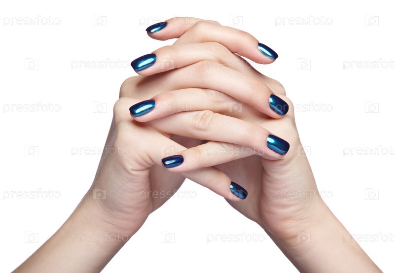 Женские руки с синим и блестящим маникюром ногтей, изолированные на белом фоне