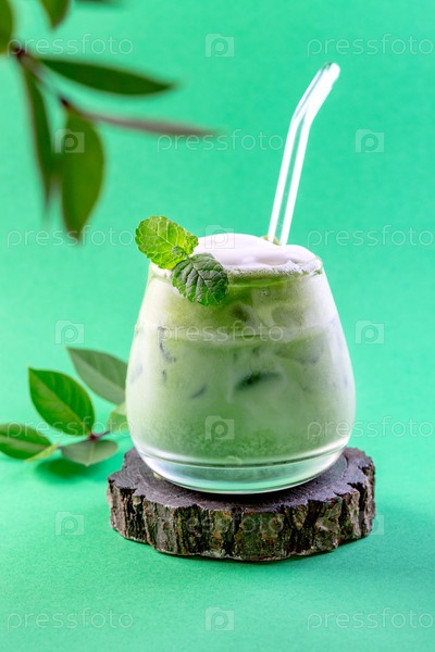 Зеленый маття латте со льдом и веточкой мяты