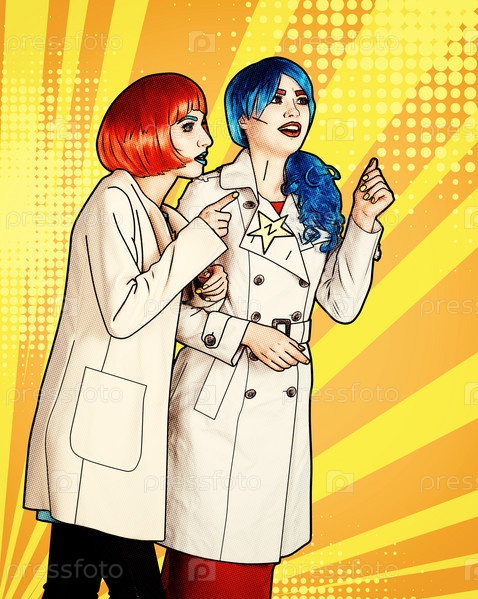 Женщины-детективы расследуют преступление. Молодые женщины в стиле комического поп-арта