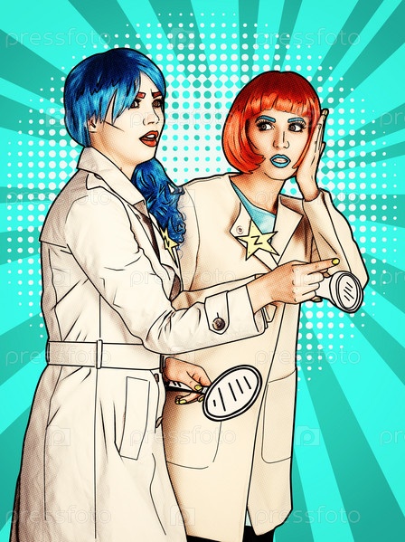 Женщины-детективы расследуют преступление. Молодые женщины в стиле комического поп-арта