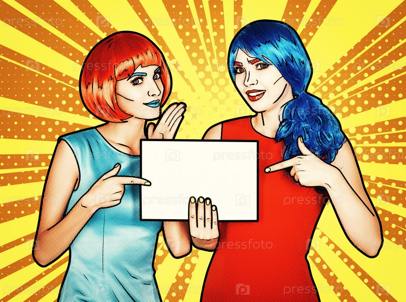 Женщины с бумагой в руках. Портрет молодых женщин в стиле комического поп-арта
