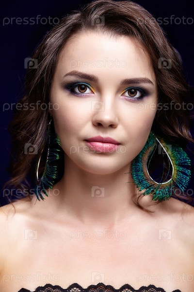 Портрет красивой брюнетки на черном фоне и серьгах из павлиньих перьев