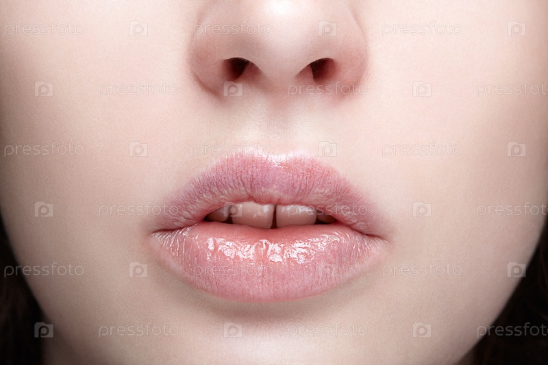 Крупным планом макро портрет женской части лица. Губы человека с дневным макияжем. Девушка с идеальной формой губ