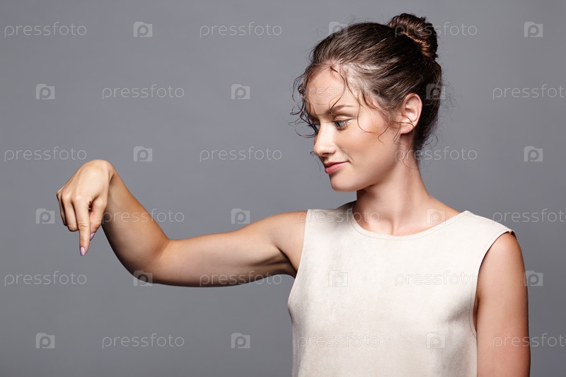 Красивая молодая женщина улыбается и указывает на пространство для копирования на сером фоне
