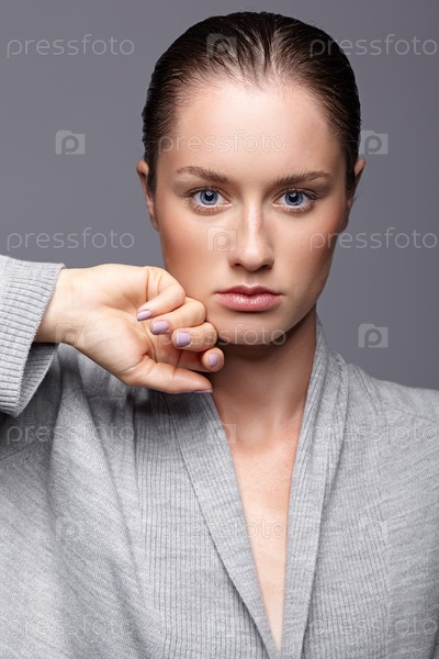 Портрет красоты молодой женщины в сером платье. Брюнетка с ярко-голубыми глазами и дневным женским макияжем