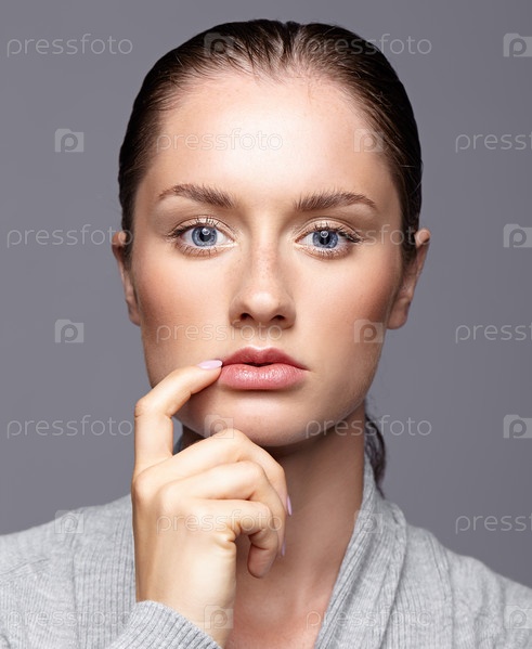 Портрет красоты молодой женщины в сером платье. Брюнетка с ярко-голубыми глазами и дневным женским макияжем