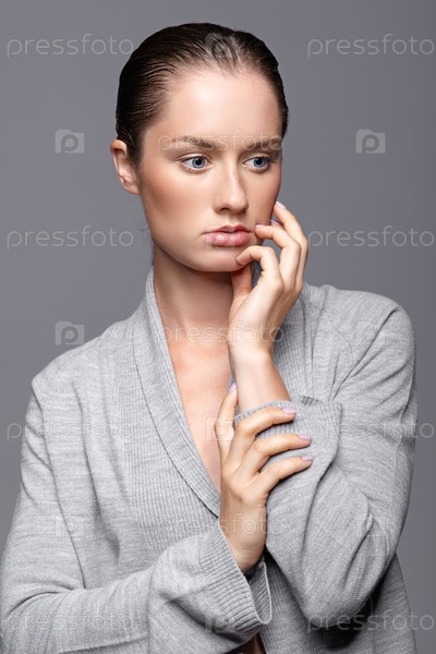 Портрет красоты молодой женщины в сером платье. Брюнетка с ярко-голубыми глазами и дневным женским макияжем