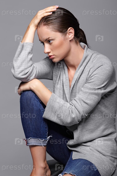 Портрет красоты молодой женщины в сером платье. Брюнетка с ярко-голубыми глазами и дневным женским макияжем