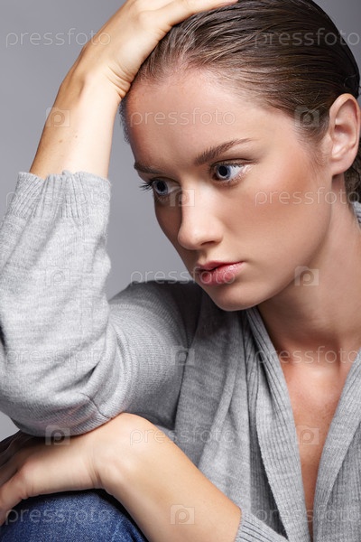 Портрет красоты молодой женщины в сером платье. Брюнетка с ярко-голубыми глазами и дневным женским макияжем