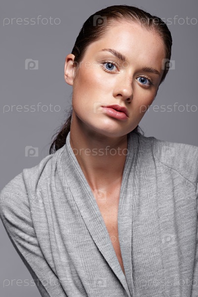 Портрет красоты молодой женщины в сером платье. Брюнетка с ярко-голубыми глазами и дневным женским макияжем