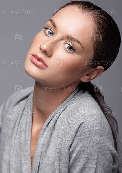 Портрет красоты молодой женщины в сером платье. Брюнетка с ярко-голубыми глазами и дневным женским макияжем