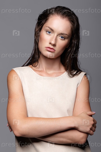 Портрет красоты молодой женщины. Брюнетка с ярко-голубыми глазами и дневным женским макияжем на сером фоне