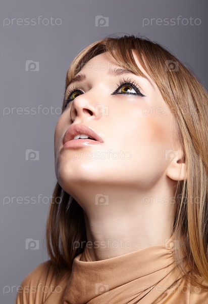 Портрет молодой блондинки, глядя вверх. Женщина с зелеными глазами и длинными волосами. Девушка в бежевом платье на сером фоне