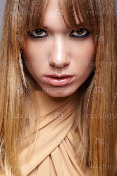 Портрет блондинки молодой женщины. Женщина с зелеными глазами и длинными волосами. Девушка в бежевом платье на сером фоне