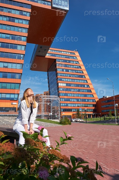 Современная молодая женщина на ступенях здания Центра информационных технологий в Академгородке. Символ Новосибирского технопарка