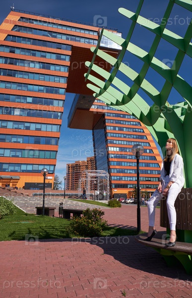 Современная молодая женщина на ступенях здания Центра информационных технологий в Академгородке. Символ Новосибирского технопарка
