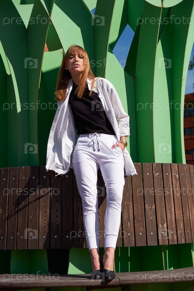Современная молодая женщина на ступенях здания Центра информационных технологий в Академгородке. Символ Новосибирского технопарка