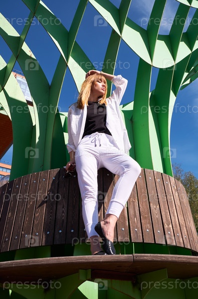 Современная молодая женщина на ступенях здания Центра информационных технологий в Академгородке. Символ Новосибирского технопарка
