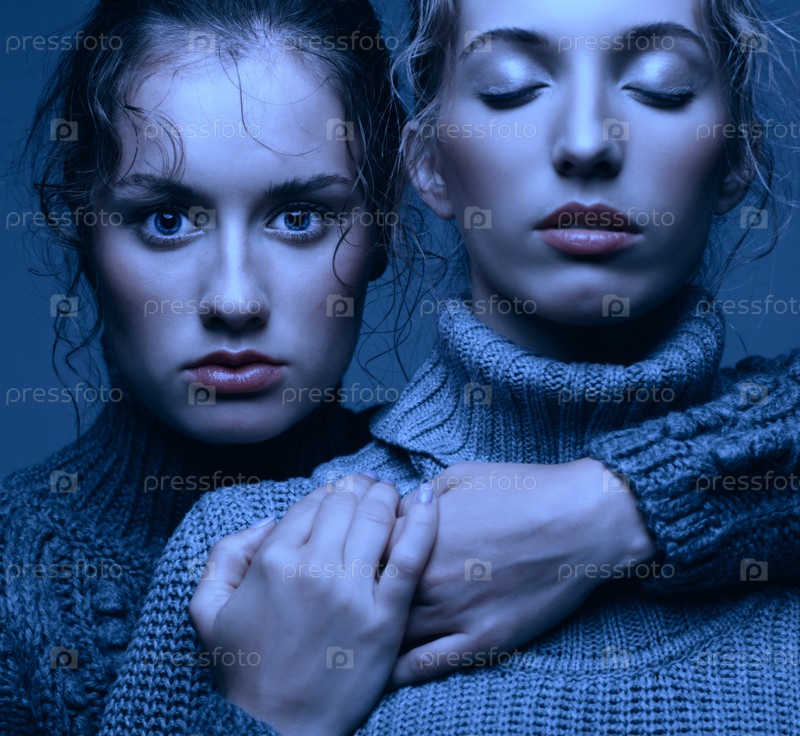 Хэллоуин красота портрет двух молодых женщин в серых свитерах на сером фоне. Красивые девушки протягивают руки в объятиях. Одна девушка с закрытыми глазами