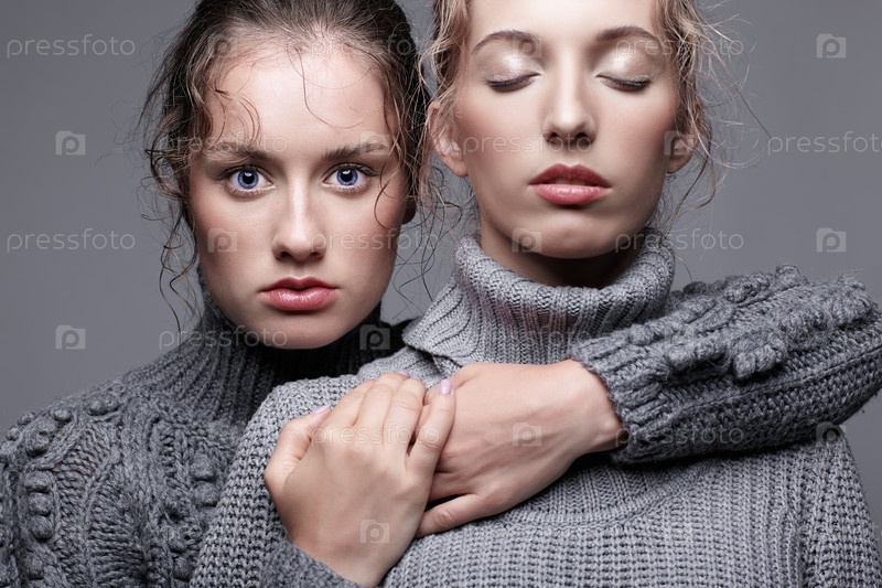 Две молодые женщины в серых свитерах на сером фоне. Красивые девушки протягивают руки в объятиях. Одна девушка с закрытыми глазами
