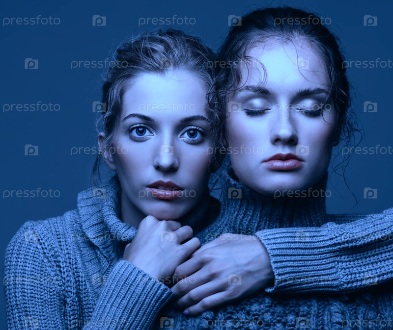 Хэллоуин красота портрет двух молодых женщин в серых свитерах на сером фоне. Красивые девушки протягивают руки в объятиях. Одна девушка с закрытыми глазами