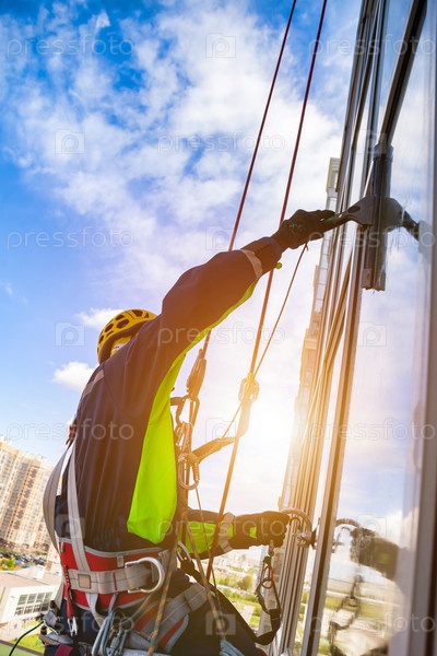 Промышленный альпинист в униформе, моющий наружное остекление