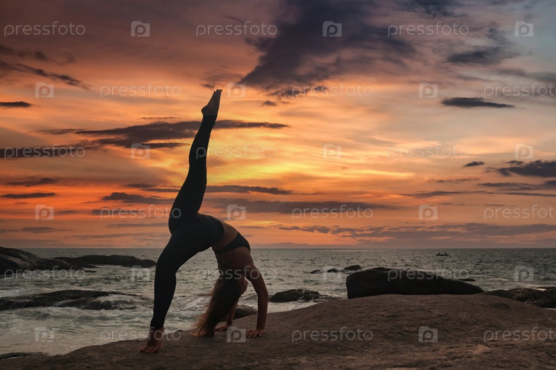 Молодая женщина силуэта занимается йогой в шпагате или шпагате для здорового образа жизни на тропическом берегу моря