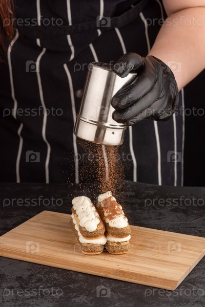 Приготовление десертного торта тирамису на темном фоне в кафе