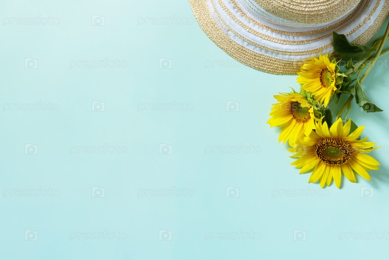 Соломенная шляпа и подсолнухи на пастельно-зеленом фоне. Летний отдых, концепция отпуска. Плоская планировка, вид сверху, пространство для копирования