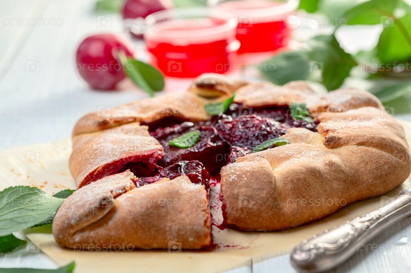 Открытый пирог из творожного теста с красными сливами