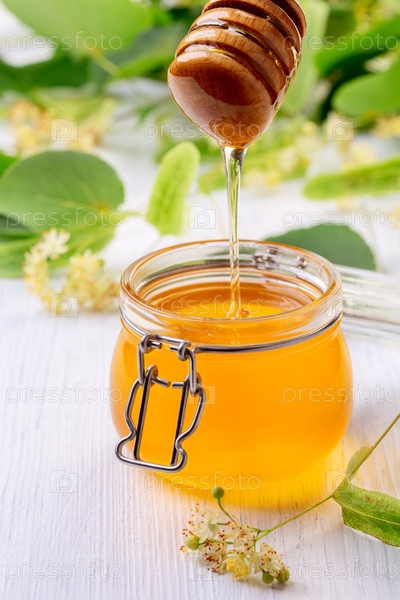 Свежий органический мед и цветки липы