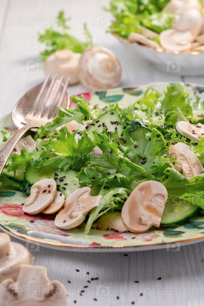 Витаминный салат из огурцов, зеленого салата и сырых грибов