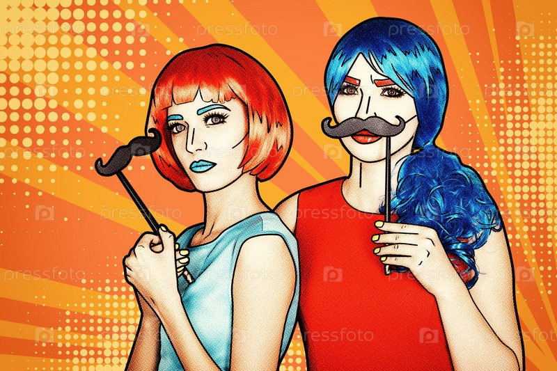 Женщины в красных и синих париках. Девушки с накладными усами в руках