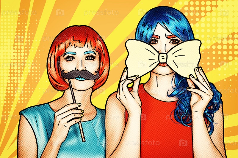 Женщины в красных и синих париках. Девушки с желтым галстуком-бабочкой и накладными усами