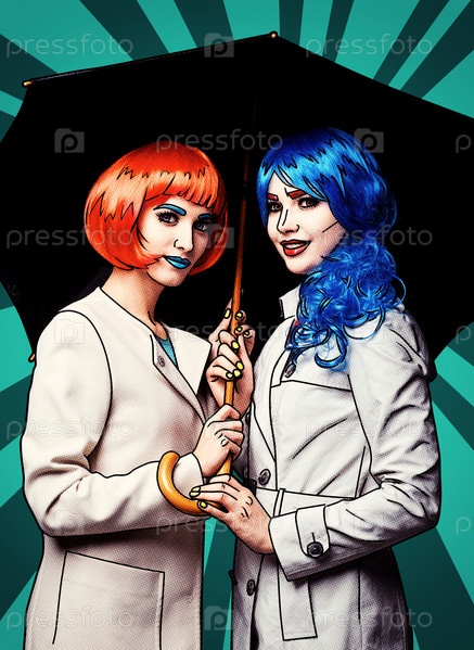 Портрет молодых женщин в стиле комического поп-арта. Женщины с зонтиком
